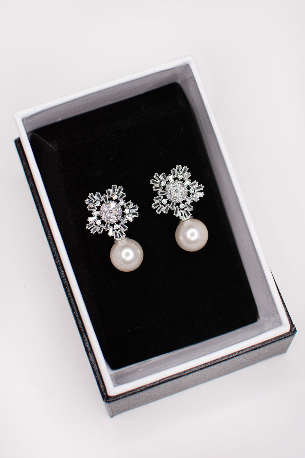 Zoe is a beautiful stud earring detailed with quality tiny baguette shaped stones in a stunning snowflake formation with a single gleaming pearl resting below. Zoe is perfect for those who do not want a long drop statement earring but are after something just as extravagant.