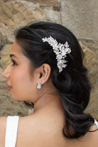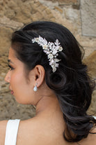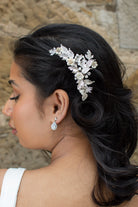 A dainty sidepiece, Piper is a beautiful and flexible arched cluster of silver plated pointed leaves and ceramic flowers. Featuring exquisite pearl and crystal embellishments, Piper is a bridal sidepiece straight out of a fairytale. Piper is fitted with a strong clip at the back for an easy and comfortable wear.